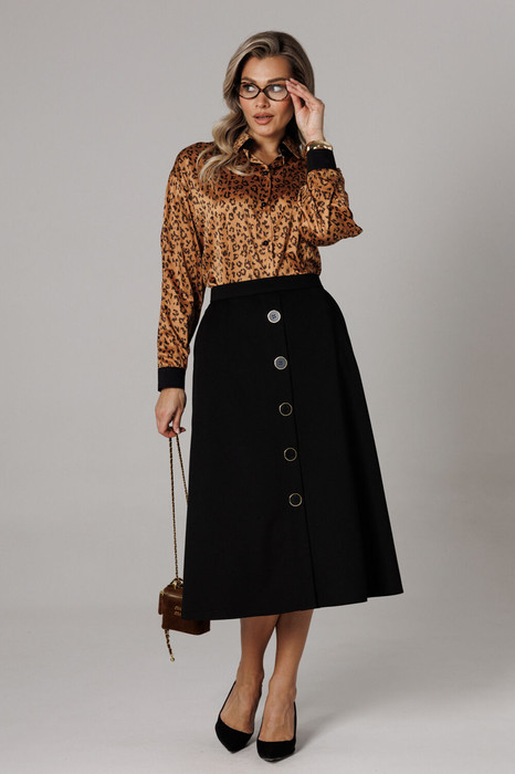 Оригинальный комплект женский 2-х пердментый (блузка, юбка)  от бренда Anastasia, идеальный для любого случая. Этот комплект сочетает в себе элегантность и комфорт, что делает его подходящим как для повседновной носки, так и для праздничных мероприятий.    Блузка из атласной ткани прямого силуэта со спущенным плечом. По бокам закругленные разрезы. Рукав с запахом и разрезом, на манжете. Застежка – планка на петли и пуговицы. Воротник на отрезной стойке. Стойка и манжета из отделочной ткани. По спинке идет отрезная кокетка. Такой женский офисный стиль можно носить, сочетая с другими вещами гардероба, создавая новые образы. Ткань атласная качественная и очень комфортная. Юбка А-силуэта, длинна миди.  По передней части идет застежка-обманка с пуговицами.  По бокам карманы. По спинке средний шов, переходящий в застежку молнию. Пояс отрезной . Длина по спинке: (48-52)-70 см, (54-58)-72 см. Длина рукава с манжетой: (48-52)-55 см, (54-58)-57 см. Длина юбки: (48-58)-80 см