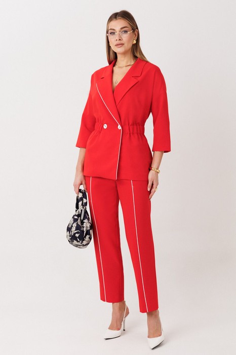 Стильный  женский костюм  от бренда Anastasia, идеальный для любого случая. Этот костюм сочетает в себе элегантность и комфорт, что делает его подходящим как для деловых встреч или прогулок. Комплект состоит из жакета и брюк. Костюм женский 2-хпредметный (жакет и брюки). Жакет на подкладке из текстильной ткани полуприлегающего силуэта со спущенным плечом. Приталивание по талии создается за счет кулиски с резинкой. По полочке идут грудовые выточки из бокового шва. Застежка двубортная. Воротник английского типа. По правому борту идет отделка- кант. По бокам карманы. По спинке средний шов. Рукав 3/4. Брюки, зауженные к низу. Пояс на резинке. По передней части – вставка кант. Стильный костюм отлично подойдет для долгих прогулок или для работы, для офиса.  Отдельный части костюма легко будут сочетаться с вещами из Вашего гардероба. Модель можно отнести к стилю кэжуал. Костюм можно носить с туфлями, кроссовками или ботинками. Обязательно добавьте наш бренд в избранное и следите за новинками, распродажами, скидками и акциями! Хороших покупок от «Анастасия». Длина  (по спинке):(50-52)- 69см, (54-58)-70 см, (60-64)-71см.  Длина рукава: (50-64)- 32см. Длина брюк: (50-54):- 91см, (56-60)- 64см, (62-64)-96см