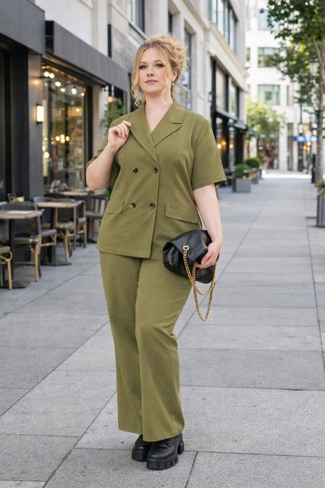 Стильный костюм женский 2-х предметный (жакет, брюки) от Anastasia подойдет как для повседневной носки (работа, офис, прогулки), так и для праздничных выходов. Достаточно дополнить его соответствующими аксессуарами. Предметы комплекта легко будут сочетаться с вещами из Вашего гардероба. Отлично будет смотреться с разными видами обуви. Жакет двухбортный, полуприлегающего силуэта со спущенным плечом, по спинке средний шов и выточки, по полочке талиевая высточка из бокового шва. Воротник "пиджачного" типа, карман клапан "обманка". Брюки прямые, пояс на резинке, по бокам карманы. Длина жакета:(48-52)-69см., (54-58)-70см. Длина рукава: (48-52)- 18 см. Длина брюк: (48-52)-99см., (54-58)-100см.