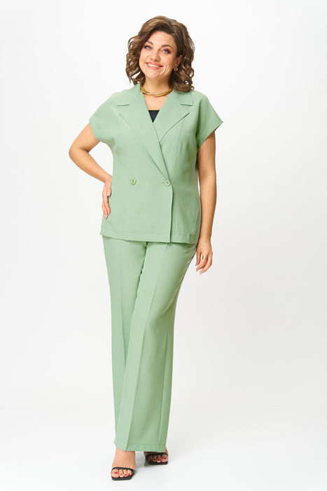 Костюм состоит из жакета и брюк, выполнен из ткани в полоску и однотонной ткани. Жакет полуприлегающего силуэта, длиной чуть ниже линии бедер. Жакет с застежками на один ряд петель и пуговиц, и воротником притачного типа. Полочка и спинка с рельефами от плечевого шва. Рукав цельнокроеный, короткий. Брюки прямые, длинные, свободные в верхней части, со стрелками. По передним половинам выполнены карманы. Брюки на притачном поясе с эластичной тесьмой.