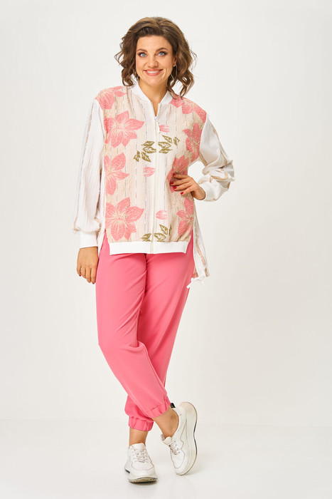 Костюм выполнен состоит из жакета и брюк. Жакет прямого силуэта, выполнен из жаккардовой ткани, в качестве отделки использовано трикотажное полотно в рубчик.