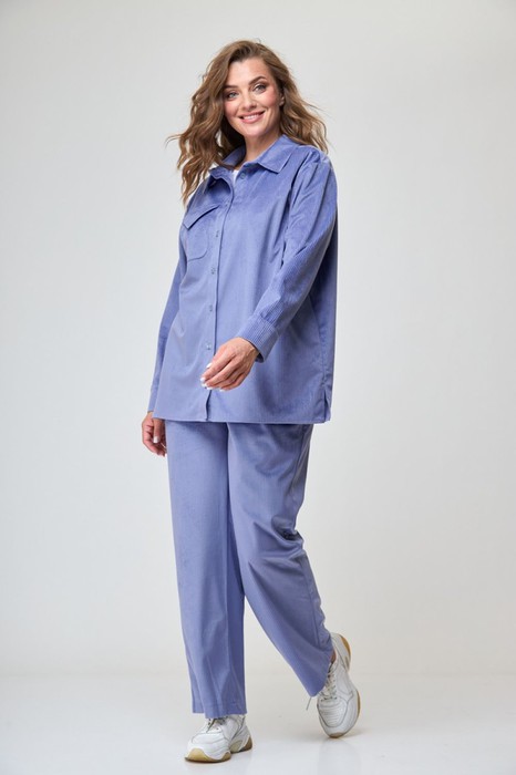 Костюм из вельвета, супер комфортный и уникальный. Рубашка прямая, с разрезами по боковым швам, длиной до бедра. Рукав длинный, с манжетами. Классический рубашечный воротник, застежка по переду на петли пуговицы. По переду справа нагрудный карман.