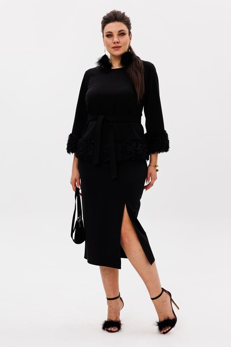 Этот изысканный костюм от Анеллли сочетает в себе кокетливость и игривость, оставаясь при этом лаконичным и нежным. Жакет с круглым вырезом горловины и 3/4 рукавами подчеркивает изящную линию плеч и создает элегантный силуэт. Пояс добавляет акцент на талии, а отделка из «меха» по низу жакета и рукавов придаёт образу нотку роскоши и утонченности.