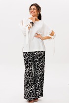 Блуза будто создана для тех, кто ценит не только стиль, но и глубину образа. Свободный крой обволакивает фигуру, подчёркивая её естественную грацию, а изящный вырез «лодочка» добавляет ноту женственности. Рукав, мягко ниспадающий до манжета с деликатными завязками, играет с силуэтом, а боковые разрезы дарят лёгкость каждому движению.