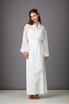 Блузка прямого силуэта. Горловина обработана отложным воротником-стойкой, по переду расположены симметричные складки и декоративная капелька, по спинке с застежкой на навесную петлю и пуговицу. Спинка со средним швом. Рукав втачной прямой длинный, по низу со сборкой и манжетой с застежкой на петлю и пуговицу.