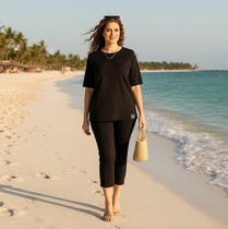 Брюки с высокой посадкой, слегка зауженные книзу, с поясом на резинке. В боковых швах имеются функциональные наклонные карманы. По низу брючин - манжет.