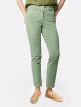 Брюки с высокой посадкой, слегка заужены книзу. Притачной пояс со шлевками и застежкой на молнию и пуговицу, по боковым - вставка из эластичной тесьмы. На задних половинках - вытачки. В боковых швах расположены функциональные косые карманы.