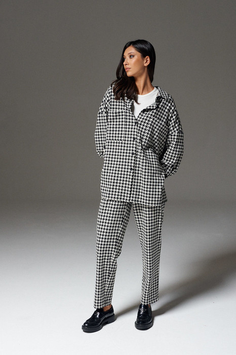 Комплект состоящий из рубашки и брюк выполнен из трикотажного полотна с геометрическим принтом.Характеристики: рубашка прямого свободного кроя, воротник классический - отложной, застежка центральная на петли пуговички, по переду крупные карманы, рукав спущен, в боковых швах разрезы, спинка цельнокроеная. Длина рубашки по спинке 73 , длина рукава 68 см от края горловины. Брюки прямого свободного кроя, пояс на резинке, в боковых швах карманы. Длина брюк 99 см.