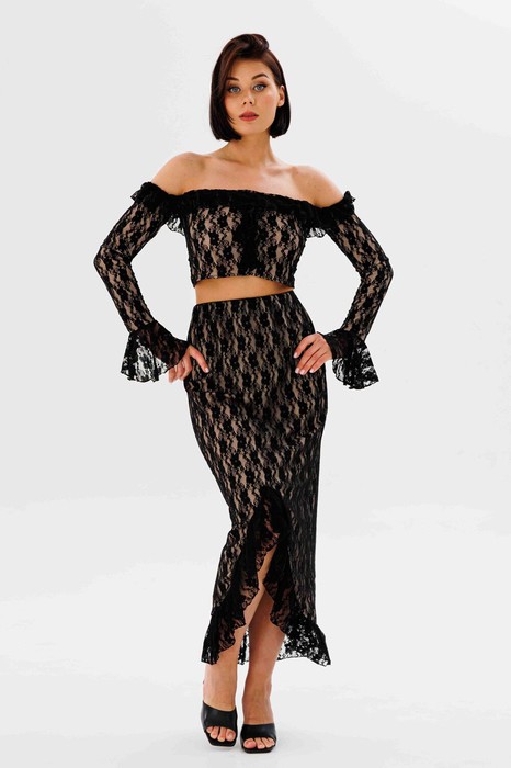 Комплект 2-хпредметный. Топ выполнен из эластичного гипюра. Верх лифа и верх рукава обработан резинкой и притачен волан. По центру лифа обработан волан. Топ обработан трикотажной эластичной подклакой. По низу рукава притачен волан со скошенным срезом. Юбка в длине миди, обработана птрикотажной эластичной подкладкой. Пояс на широкой резинке. По низу обработан волан из  гипюра. Перед юбки обработ ан фигурным разрезом.