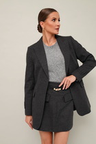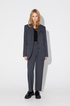 Комплект женский состоящий из жакета и брюк. Жакет прилегающего силуэта с застёжкой спереди на пуговицы, с отложным воротником с лацканами, с фигурным подрезом по переду и спинке и вставкой из сетки, с карманами по переду, с втачным рукавом. Изделие на подкладке. Брюки узкие, на поясе-кокетке, с застёжкой спереди на молнию и пуговицы, с боковыми карманами и стрелками.