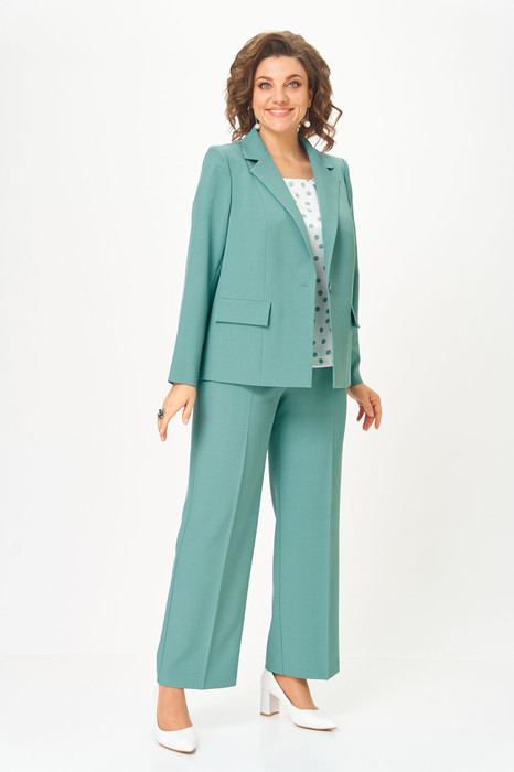 Женский трёхпредметный комплект состоит из жакета и брюк, выполненных из однотонной плательно-костюмной ткани и блузы,выполненной из сатина с оригинальным дизайном.