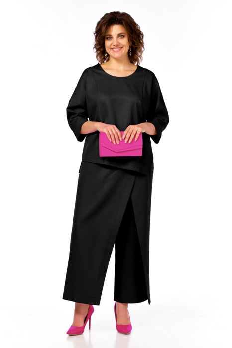 Женский нарядный двухпредметный костюм состоит из блузы и брюк с имитацией юбки спереди,выполнен из плательно-костюмной однотонной ткани с блестящим напылением.