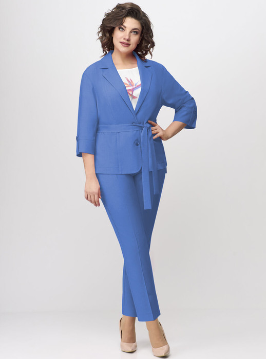 Жакет прямого силуэта с центральной застёжкой на 2 петли и пуговицы . Перед с рельефами из плеча.Плечи слегка спущены.Воротник пиджачного типа.Перед по низу с закругленными шлицами и декоративными пуговицами по боковому шву.Спинка со средним швом, удлиненная.Рукава двухшовные, длиной 3/4,по низу притачные манжеты с патами и декоративными пуговицами.Жакет дополнен поясом.