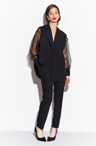 Лонгслив свободного кроя с цельной декоративной планкой по передней и задней части. Благодаря конструктивным особенностям модель делает акцент на линии плеча и создаёт дополнительную вертикаль, что невероятно стройнит и вытягивает силуэт! Горловина обработана обтачкой с открытым срезом. Низ рукава и низ изделия имеют открытые срезы. На плечах металлические декоративные зажимы золотистого цвета.