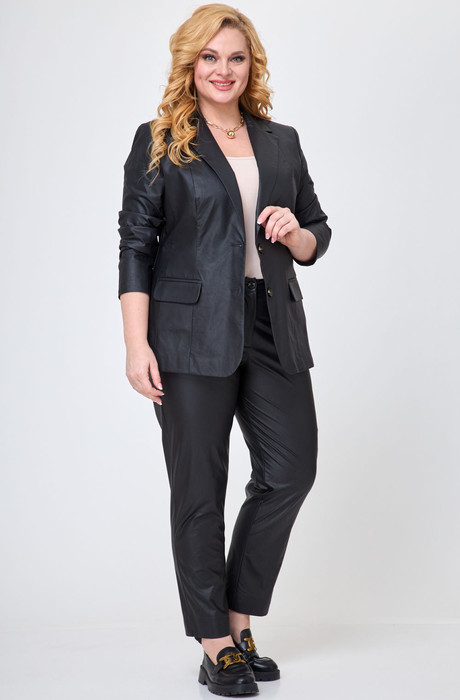 Комплект 2-х предметный состоит из жакета и брюк. Жакет женский удлиненный, полуприлегающего силуэта с центральной бортовой застежкой на пуговицы до линии перегиба лацкана. Спереди рельефные швы от плечевого шва, отрезной бочок и карман с клапаном. Спинка с рельефами от плечевого шва. Рукав втачной, двухшовный. Воротник пиджачного типа. Жакет на подкладке. Длина рукава 61,5 см, длина по спинке 70 см. Классические брюки, прямые, слегка заужены к низу, по переду обработаны карманы с отрезным бочком, застежка на тесьму-молнию и 1 пуговицу. На задних половинках обработаны вытачки и имитация карманов в рамку с двумя обтачками, пояс в брюках притачной. По низу брюк в боковом шве есть небольшой разрез. Длина брюк от талии по боковому шву 97 см