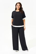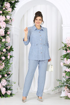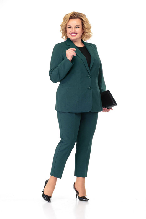 Комплект 2-х предметный состоит из жакета и и брюк. Жакет женский удлиненный, полуприлегающего силуэта с центральной бортовой застежкой на пуговицы до линии перегиба лацкана. Спереди рельефные швы от плечевого шва,отрезной бочок и карман с клапаном. Спинка с рельефами от плечевого шва. Рукав втачной, двухшовный. Воротник пиджачного типа. Перед жакета на подкладке. Длина рукава 62 см, длина жакета по спинке 70 см. Классические брюки, прямые, слегка заужены к низу, заутюжены стрелки,по переду обработаны карманы с отрезным бочком,застежка на тесьму-молнию и 1 пуговицу.На задних половинках обработаны вытачки и имитация карманов в рамку с двумя обтачками,пояс в брюках притачной. По низу брюк в боковом шве есть небольшой разрез. Длина брюк от талии по боковому шву 94 см.