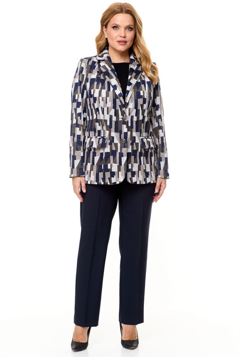 Комплект 2-х предметный состоит из жакета и и брюк. Жакет женский удлиненный,из трикотажной ткани, полуприлегающего силуэта с центральной бортовой застежкой на пуговицы до линии перегиба лацкана. Спереди рельефные швы от плечевого шва, отрезной бочок и карман с клапаном. Спинка с рельефами от плечевого шва. Рукав втачной, двухшовный. Воротник пиджачного типа. Перед жакета на подкладке, длина по спинке 67 см, длина рукава 62 см. Брюки классические,из текстильной ткани, прямые, слегка заужены к низу,заутюжены стрелки,по переду обработаны карманы с отрезным бочком,застежка на тесьму-молнию и 1 пуговицу.На задних половинках обработаны вытачки и имитация карманов с листочкой, пояс в брюках притачной. Длина брюк от талии по боковому шву 100 см.