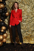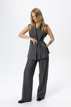 Комплект женский, 2-х предметный, состоит из жакета и и брюк. Жакет женский удлиненный, из текстильной ткани, на подкладке, полуприлегающего силуэта с центральной бортовой застежкой на пуговицы до линии перегиба лацкана. Спереди рельефные швы от плечевого шва, отрезной бочок и карман с клапаном. Спинка с рельефами от плечевого шва. Рукав втачной, двухшовный, по низу рукава обработана шлица на петли-пуговицы. Воротник пиджачного типа. Длина по спинке 66 см, длина рукава 62 см.Брюки прямые,классические, с заутюженными стрелками,по переду обработаны карманы с отрезным бочком,застежка на тесьму-молнию и 1 пуговицу.На задних половинках обработаны вытачки и имитация карманов с листочкой, пояс в брюках притачной. Длина брюк от талии по боковому шву 100 см.