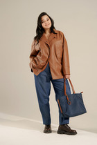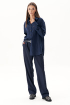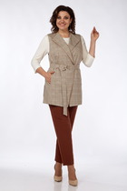 Комплект женский-двойка, из текстильной ткани, жакет удлиненный, полуприлегающего силуэта с центральной бортовой застежкой на пуговицы до линии перегиба лацкана. Спереди рельефные швы от плечевого шва, отрезной бочок и карман с клапаном. Спинка с рельефами от плечевого шва. Рукав втачной, двухшовный. Воротник пиджачного типа. Жакет на подкладке, длина по спинке 67 см, длина рукава 62 см. Брюки прямые, классические, с заутюженными стрелками, по переду обработаны карманы с отрезным бочком, застежка на тесьму-молнию и 1 пуговицу. На задних половинках обработаны вытачки и имитация карманов с листочкой, пояс в брюках притачной. Длина брюк от талии по боковому шву 103 см.