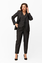 Комплект женский, 2-х предметный, состоит из жакета и и брюк. Жакет женский удлиненный, из текстильной ткани, на подкладке, полуприлегающего силуэта с центральной бортовой застежкой на пуговицы до линии перегиба лацкана. Спереди рельефные швы от плечевого шва, отрезной бочок и карман с клапаном. Спинка с рельефами от плечевого шва. Рукав втачной, двухшовный, по низу рукава обработана шлица на петли-пуговицы. Воротник пиджачного типа. Длина по спинке 66 см, длина рукава 62 см.Брюки прямые,классические, с заутюженными стрелками,по переду обработаны карманы с отрезным бочком,застежка на тесьму-молнию и 1 пуговицу.На задних половинках обработаны вытачки и имитация карманов с листочкой, пояс в брюках притачной. Длина брюк от талии по боковому шву 100 см.