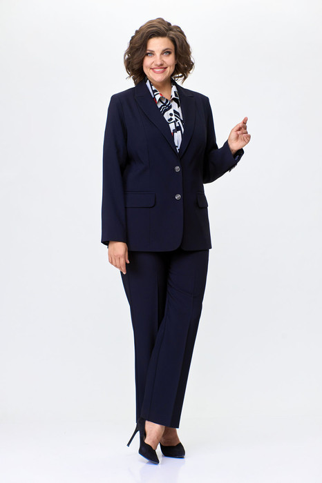 Комплект женский, 2-х предметный, состоит из жакета и и брюк. Жакет женский удлиненный, из текстильной ткани, на подкладке, полуприлегающего силуэта с центральной бортовой застежкой на пуговицы до линии перегиба лацкана. Спереди рельефные швы от плечевого шва, отрезной бочок и карман с клапаном. Спинка с рельефами от плечевого шва. Рукав втачной, двухшовный, по низу рукава обработана шлица на петли-пуговицы. Воротник пиджачного типа. Длина по спинке 66 см, длина рукава 62 см.Брюки прямые,классические, с заутюженными стрелками,по переду обработаны карманы с отрезным бочком,застежка на тесьму-молнию и 1 пуговицу.На задних половинках обработаны вытачки и имитация карманов с листочкой, пояс в брюках притачной. Длина брюк от талии по боковому шву 100 см.