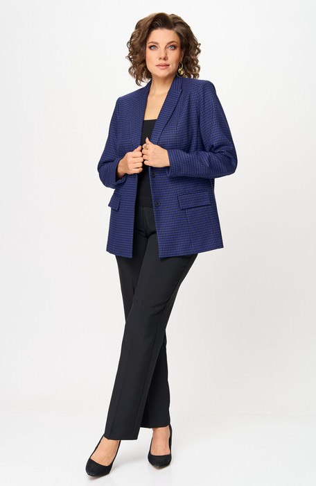 Комплект женский-двойка, из текстильной ткани, жакет удлиненный, полуприлегающего силуэта с центральной бортовой застежкой на пуговицы до линии перегиба лацкана. Спереди рельефные швы от плечевого шва, отрезной бочок и карман с клапаном. Спинка с рельефами от плечевого шва. Рукав втачной, двухшовный. Воротник пиджачного типа. Жакет на подкладке, длина по спинке 66 см, длина рукава 62 см. Брюки прямые, классические, с заутюженными стрелками, по переду обработаны карманы с отрезным бочком, застежка на тесьму-молнию и 1 пуговицу. На задних половинках обработаны вытачки и имитация карманов с листочкой, пояс в брюках притачной. Длина брюк от талии по боковому шву 103 см.