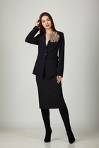 Комплект женский-двойка, из текстильной ткани, жакет удлиненный, полуприлегающего силуэта с центральной бортовой застежкой на пуговицы до линии перегиба лацкана. Спереди рельефные швы от плечевого шва, отрезной бочок и карман с клапаном. Спинка с рельефами от плечевого шва. Рукав втачной, двухшовный. Воротник пиджачного типа. Жакет на подкладке, длина по спинке 67 см, длина рукава 62 см.Юбка прямого силуэта, с небольшой кокеткой в верхней части, которая обработана обтачкой, спереди обработан разрез-шлица. Заднее полотнище со средним швом и талиевыми вытачками, застегивается на потайную молнию. Длина по боковому шву 74 см. Юбка на подкладке.