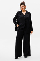 Комплект женский-двойка,из костюмной ткани, жакет удлиненный, свободного силуэта с центральной бортовой застежкой на пуговицы до линии перегиба лацкана. По переду имеется отрезной бочок и вертикальные вытачки. С прорезными карманами с клапаном и двумя обтачками. Спинка цельная. Воротник пиджачного типа. Рукав двухшовный, втачной. Жакет на подкладке. Длина рукава 63 см, длина по спинке 75 см. Брюки прямые, классические, из текстильной ткани, с заутюженными стрелками, по переду обработаны карманы с отрезным бочком, застежка на тесьму-молнию и 1 пуговицу. На задних половинках обработаны вытачки и имитация карманов с листочкой, пояс в брюках притачной. Длина брюк от талии по боковому шву 103 см.