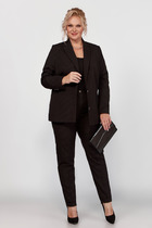 Комплект 2-х предметный из текстильной ткани состоит из жакета и и брюк. Двубортный жакет, свободного кроя, на подкладке. По переду имеется отрезной бочок и вертикальные вытачки. С прорезными карманами с клапаном и двумя обтачками. Спинка цельная. Воротник пиджачного типа. Рукав двухшовный, по низу рукава обработана шлица на петли-пуговицы. Длина рукава 63 см, длина по спинке 74 см. Классические брюки, прямые, слегка заужены к низу,заутюжены стрелки,по переду обработаны карманы с отрезным бочком,застежка на тесьму-молнию и 1 пуговицу.На задних половинках обработаны вытачки и имитация карманов с листочкой, пояс в брюках притачной. Длина брюк от талии по боковому шву 97 см.