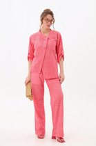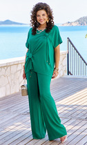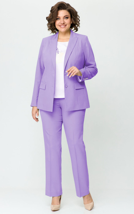 Комплект женский, 2-х предметный, состоит из жакета и и брюк. Жакет женский удлиненный, из текстильной ткани, на подкладке, полуприлегающего силуэта с центральной бортовой застежкой на пуговицы до линии перегиба лацкана. Спереди рельефные швы от плечевого шва, отрезной бочок и карман с клапаном. Спинка с рельефами от плечевого шва. Рукав втачной, двухшовный, по низу рукава обработана шлица на петли-пуговицы. Воротник пиджачного типа. Длина по спинке 66 см, длина рукава 62 см. Брюки прямые,классические, с заутюженными стрелками, по переду обработаны карманы с отрезным бочком, застежка на тесьму-молнию и 1 пуговицу. На задних половинках обработаны вытачки и имитация карманов с листочкой, пояс в брюках притачной. Длина брюк от талии по боковому шву 105 см.