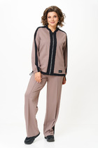 Комплект женский двойка, нарядный, из текстильной ткани с умеренным блеском. Блуза женская, свободного силуэта, воротник пиджачного типа, рукав втачной, по низу манжета. По переду блузку имеются нагрудные вытачки, по спинке кокетка и складка, низ фигурный. Длина по спинке 81 см, длина рукава 58 см. Брюки-палаццо, выполнены с карманами с отрезным бочком в боковом шве. Пояс притачной, застёжка на молнию. По задним половинкам обработаны вытачки. Длина по боковому шву 108 см.