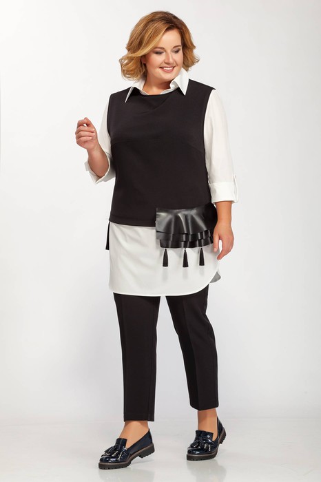 Костюм женский трех предметный. Брюки на поясе с отделочными полосками по бокам. Блузка удлиненная с закругленными разрезами по бокам. Рукав 3\4 с манжетой патай. Воротник рубашечный на стойке. Жилет с подрезами по переду и декоративной отделкой.