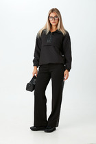 Комплект женский двухпредметный состоит из блузки и брюк. Блузка асимметричная выполнена из тонкой блузочной  ткани, свободного силуэта с одной стороны по полочке расширенная к низу, в боковых швах разрезы, воротник на стойке,планка втачная, застежка на петли и пуговицы. Рукав втачной 3/4  с притачным манжетом с разрезом. Длина изделия 80 см, рукава- 50 см. Брюки (легинсы) прилегающего силуэта,выполнены из эко-замши с добавлением эластана с декоративными подрезами, спинка  украшена нефункциональной листочкой, пояс на резинке. Длина изделия-103 см.