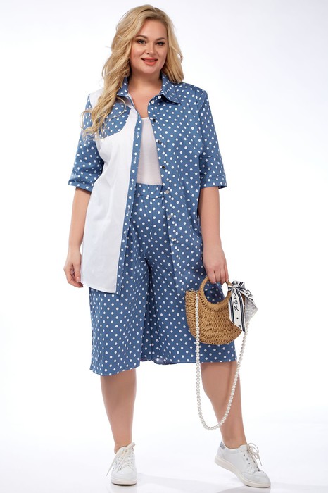 Костюм женский свободного силуэта. Состоит из блузки и шорт. Выполнен из хлопковой ткани. Блузка с центрально-бортовой застежкой на петли и пуговицы, воротник втачной на стойке, одна из полочек выполнена из контрастной ткани и украшена карманом, в боковых швах разрезы, рукав короткий втачной. Шорты свободные, в боковых швах карманы, пояс на резинке.