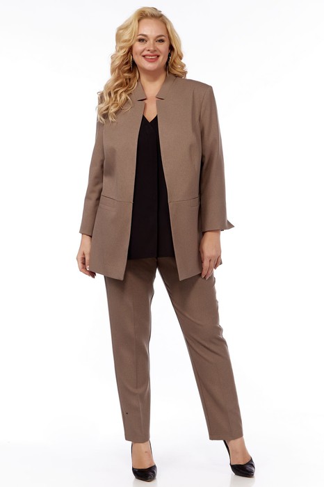 Костюм женский двухпредметный полуприлегающего силуэта,состоит из жакета и брюк .Жакет с декоративным подрезом по переду полочки,рукав втачной 3/4 с разрезом в локтевом шве,без воротника,застежка на крючек,карманы листочки обработаны в подрезе. Брюки на поясе с застежкой молния и пуговица.