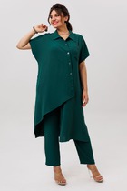 Костюм женский двухпредметный, состоит из блузки и юбки. Блузка свободного силуэта с цельнокройным рукавом, в боковом шве разрезы. Юбка-колокольчик с драпировкой по переду, обтачка резинка.