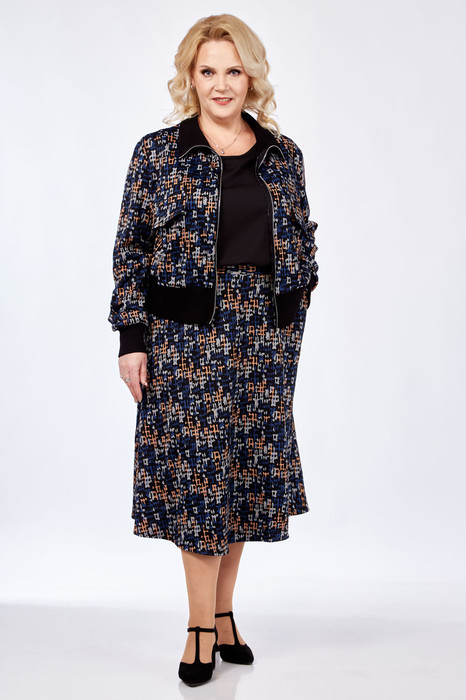 Костюм женский, двухпредметный, свободного силуэта, выполнен из трикотажной ткани. Состоит из джемпера и юбки. Джемпер с застежкой молния по центру, полочка украшена декоративными клапанпми, рукав втачной, длинный. Стойка, манжет рукава и низ джемпера выполнены из контрастной черной ткани. Длина джемпера по спинке 50см. Юбка А- силуэта с притачным поясом на резинке, с карманами. Длина юбки 70 см.