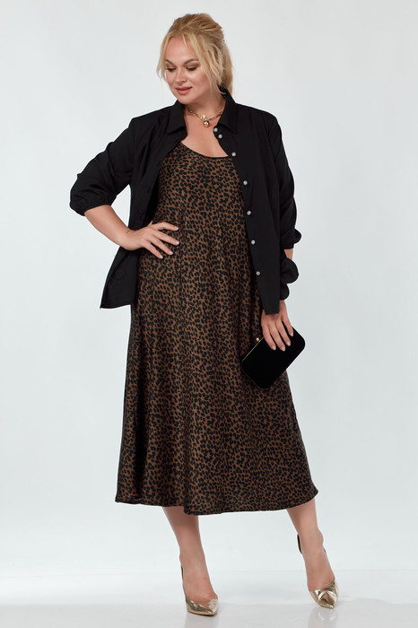 Костюм женский 2-УХ предметный. Платье и блузка. Платье длинное на брителях. Блузка с центральнобортовой застежкой на петли и пуговици, рукав втачной с манжетом. Перед украшен цветами.