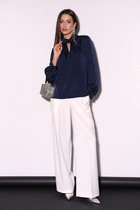 Брюки свободного силуэта, прямые к низу, выполнены из атласной ткани, брюки без застежки, верх брюк на поясе с резинкой.