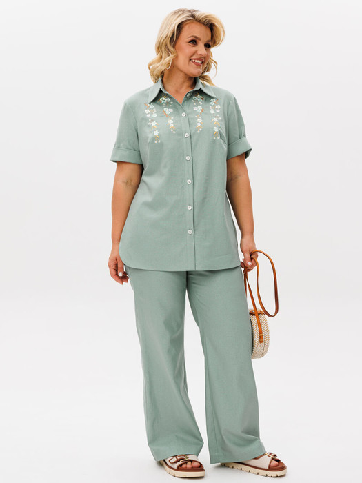 Льняной комплект из блузки и брюк - это стильный удобный и универсальный ансамбль. Блузка полуприлегающего силуэта. Застежка на петли - пуговицы. Рукав короткий. По боковым швам - разрезы. По переду расположена вышивка.