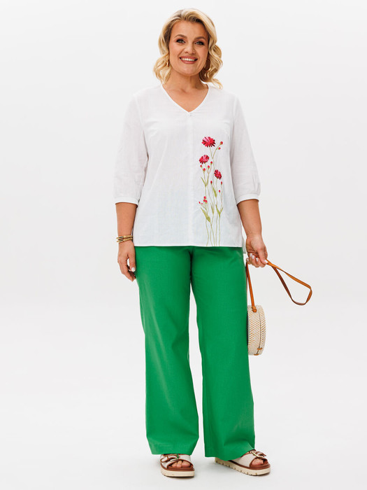 Комплект из мягкой хлопковой  блузки и  льняных с вискозой брюк- это стильный, удобный образ. Блузка полуприлегающего силуэта. По переду расположена нагрудная вытачка, c V- образным вырезом горловины. Рукав укороченный, со сборкой и манжетой.  По переду расположена яркая дизайнерская вышивка. Спинка лаконичная. Льняные брюки свободного кроя. Пояс на резинке, для удобства в носке в пояс вставлен шнурок для регулирования объема по талии. Посадка брюк - высокая. По переду расположены карманы с наклонным входом. По низу широкая подгибка для возможности коррекции по длине. Брюки с хорошей посадкой, в этом заключается их секрет универсальности и возможности носить их девушкам с любым типом фигуры. Идеальные брюки для летней жары, в них ваша кожа будет дышать. Они выполнены из мягкого льна с вискозой. Отличный вариант, как для городского лета, работы, встреч  и отдыха на море.