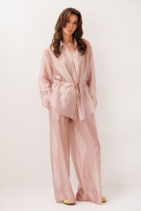 Блузка прямого силуэта, с длинным втачным одношовным рукавом. Полочка с застежкой на притачной планке на петли-пуговицы. По полочке и спинке настрочена кулиса со втянутым в него шнурком из основной ткани с наконечниками. Воротник рубашечный отложной на стойке. Спинка и полочка с фигурным низом.  Внизу по боковым швам обработаны разрезы.