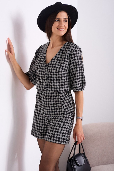 Это смелый и стильный образ для тех, кто не боится экспериментов. Клетка снова в моде, а этот укороченный комплект сочетает в себе дерзость и элегантность.
