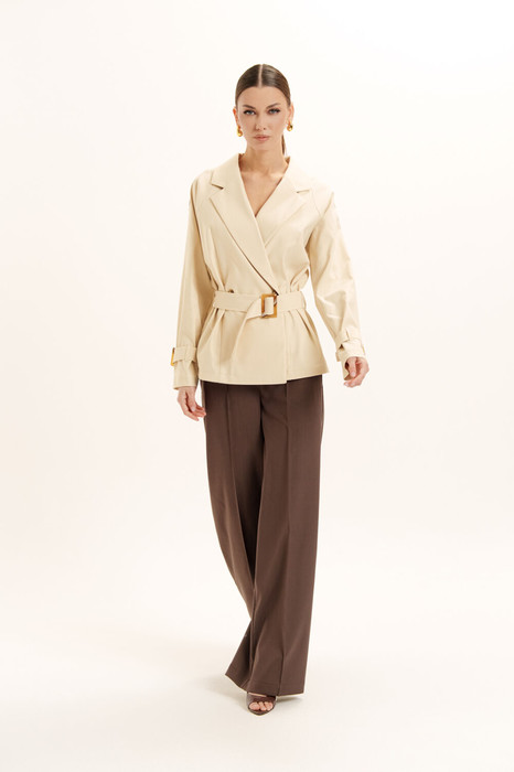 Костюм женский двухпредметный, без подкладки. Жакет прямого силуэта с отлетной кокеткой по спинке и двубортной застежкой. Воротник пиджачного типа с лацканами и застежкой на петли и пуговицы. Рукав реглан, на плечевых швах обработаны хлястики с застежкой на петлю и пуговицу. По низу рукава пришиты шлевки и обработаны паты с декоративной пряжкой. В изделии есть съемный пояс, застежка на декоративную пряжку. Брюки - прямые. По переду и спинке брюк отделочная строчка по стрелкам. Пояс - отрезной с застежкой на молнию и петлю с пуговицей и частично на резинке. В боковых швах обработаны карманы. Отделочная фурнитура может меняться.