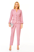 Комплект брючный из трикотажного полотна. Кардиган с центральной застежкой на 4 петли и пуговицы. Перед с накладным карманом на правой полочке и печатью в виде крыла бабочки на левой полочке. Рукав втачной одношовный с манжетом из довяза в полоску. По борту и горловине довяз в полоску. Брюки прямого силуэта с поясом на резинке. По передним половинам брюк отстрочена стрелка.