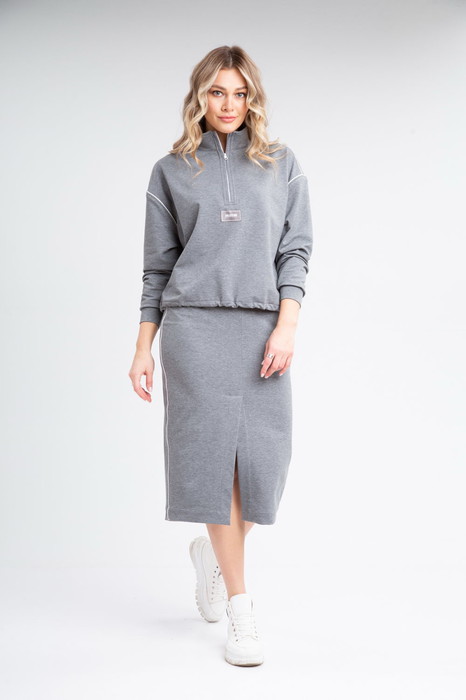 Костюм женский с юбкой. Кофта прямого силуэта с застежкой на тесьму-молнию по горловине переда. Линия плеча спущенная, рукав втачной одношовный с притачным манжетом по низу. Воротник-стойка. По низу кулиса с резинкой на фиксаторах. В качестве отделки используется отделочный кант и фурнитура. Юбка зауженная в низу, на переднем и заднем полотнище средний шов заканчивающийся шлицей. Верхний срез обработан поясом с резинкой. В качестве отделки используется отделочный кант и фурнитура.