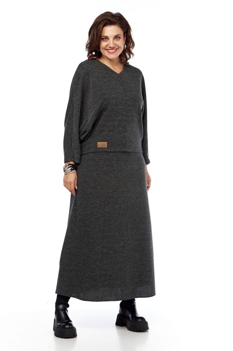 Костюм женский с юбкой из трикотажа. Кофта с цельнокроенными рукавами и отрезными бочками. Перед со средним швом и защипом на 0,2 см вдоль него. Спинка со средним швом. Горловина V-образной формы. В качестве отделки нашивка в правом нижнем углу переда. Юбка длинная, расклешеная к низу. Заднее полотнище со средним швом. Пояс выполнен из декоративной эластичной тесьмы. Внешний вид фурнитуры может отличаться от заявленной на фото.