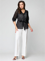 Комплект женский состоит из блузона и сарафана. Сарафан полуприлегающего силуэта, на бретелях, со средним швом по спинке, который заканчивается разрезом. По переду нагрудные вытачки, в боковых швах обработаны карманы. Блузон свободного кроя со спущенной линией плеча. Втачной одношовный рукав с регулируемой длиной с помощью хлястика. По переду накладные карманы. По спинке кокетка. Воротник стояче-отложной с отрезной стойкой.