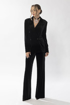 Комплект брючный состоит из блузы и брюк. Блуза прямого кроя со спущенной линией плеча. Перед с кантом из отделочной ткани по среднему шву. Левая часть переда украшена печатью. Спинка со средним швом. Рукав одношовный с кантом по окату и манжетам из отделочной ткани. Горловина округлой формы  с кантом. По бокам обработаны разрезы. Брюки прямые, свобюдного кроя. По боковым швам кант из отделочной ткани и карманы. Пояс притачной, на резинке.