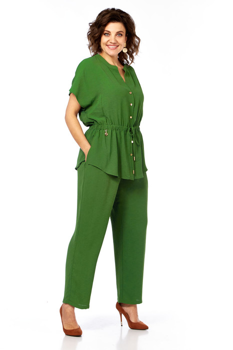Комплект брючный состоит из блузы и брюк. Блуза полуприлегающего силуэта с центральной застежкой на петли и пуговицы. Линия плеча спущенная, воротник стояче-отложной с отрезной стойкой. По переду и спинке на линии талии -кулиса со шнуром. По боковым швам разрезы. Брюки прямые, верхний срез обработан поясом с резинкой. В бококвых швах карманы. В качсетве отделки используется шнур.